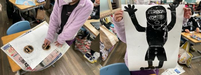 一生懸命仕上げました! 3年生が図画工作科の学習で紙版画を行っています。今日も素敵な作品が刷りあがっていました。画用紙で作った自分の姿にインクを塗り、版画用紙をバレ…