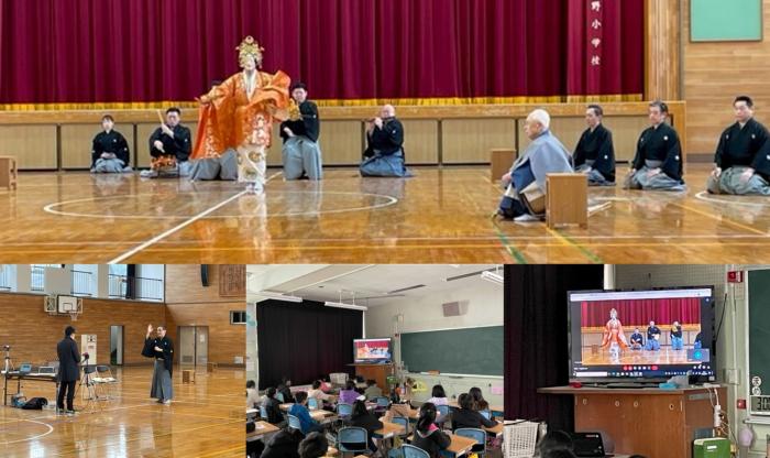 伝統芸能に親しむ 文化庁主催による「子どものための文化芸術鑑賞・体験支援事業」が本校体育館で行われました。鑑賞したのは、「能」です。