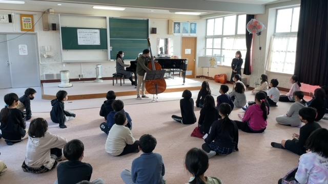 コントラバスってどんな楽器? アルカスSASEBO主催によるアウトリーチ音楽会が4年生対象に行われました。場所はいつも音楽の授業を受けている音楽室です。