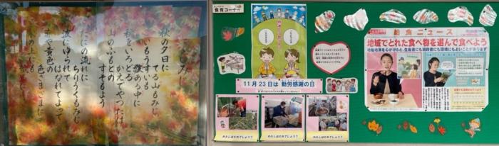11月も残りわずか…。 校舎内外に大野小学校はたくさんの掲示板があります。各学年で子dもたちの作品を掲示してあるものもあれば、季節に関するもの、各委員会や食育や保健…