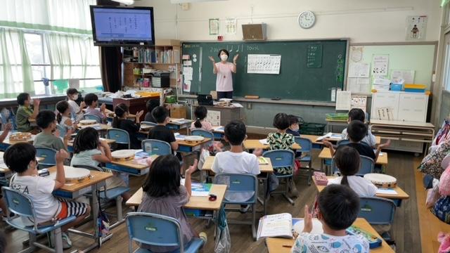 テンブリンとテスタネット 2年生が音楽でリズム打ちを学習していました。実際に楽器を使う前に、手を使ってリズムを打ち、練習していました。