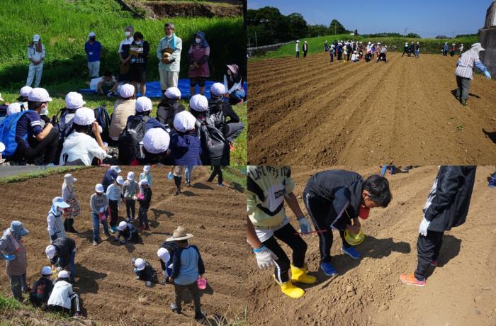 大きくなぁれ! 5年生が、総合的な学習で取り組む「味噌作り」に使う大豆を、地域やJAの方々といっしょに種植えを行いました。晴天で、とても暑かったのですが、子…
