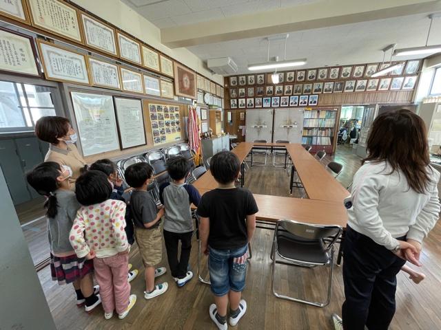どこに何があるかな? 1・2年生が、学校探検を行いました。2年生が1年生をエスコートして、大野小学校のいろいろな教室や施設を見て回りました。1年生に丁寧に教室の説…