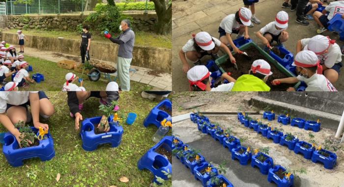 大きく育ってね! 2年生の生活科で育てるミニトマトを、学校管理員の石田さんにお手伝いいただきながら、自分たちの鉢に植えました。これから水やりなどの世話をし、生…