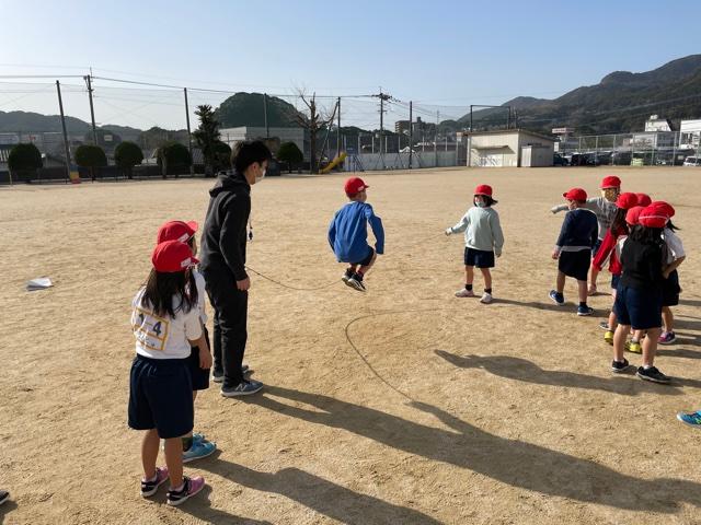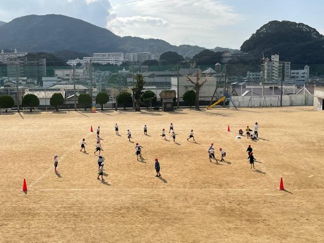 元気いっぱいに! 大寒を過ぎ、寒の内ですが、今日は日向では温かさを感じる陽気でした。そんな中、運動場で元気に体育をする1年生がいました。