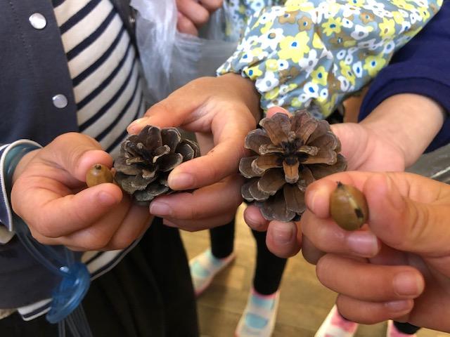 小さな小さな宝物 朝、1年生の子供たちが、小さな袋を大事そうに抱えて廊下を歩いていました。「何を持っているの?」と尋ねると、その袋から松ぼっくりやドングリを出…