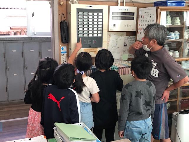 万が一に備えての設備 3年生の社会科「火事からくらしを守る」の学習で、3年生が職員室の防火設備を確認しています。