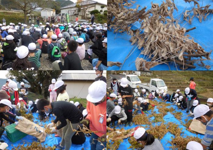 119日かけて 7月21日、予期せぬ雨が降ってしまった日に5年生が植えた大豆が、ようやく収穫の日を迎えました。植えてから119日、しっかりと育った大豆をJA…