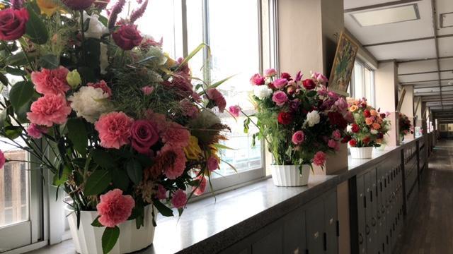 色とりどりの花に囲まれて 大野小学校職員室、校長室前の廊下に色とりどりの花が飾ってあります。これは、佐世保市生花業協同組合の方から、希望のあった学校へ寄贈されたもので…