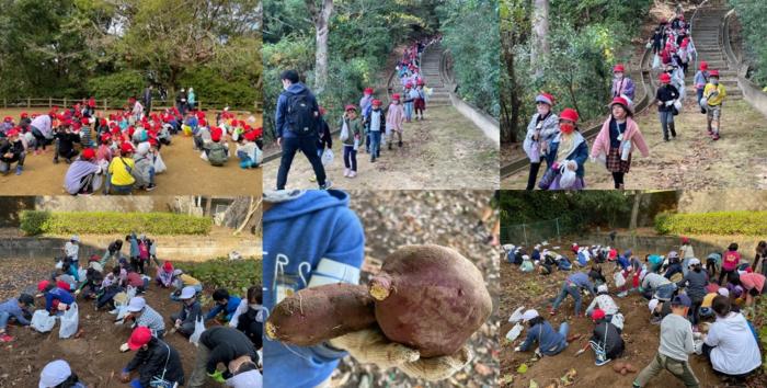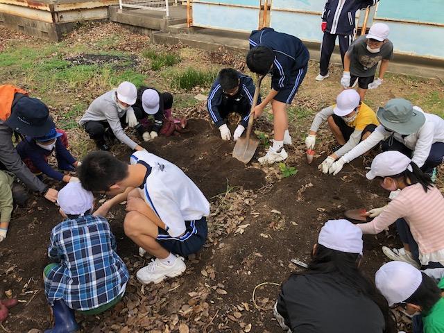 仲良く収穫しました! 大野小・春日小・大野中学校の特別支援学級が、交流活動として大野中が育てたおイモを一緒に収穫しました。