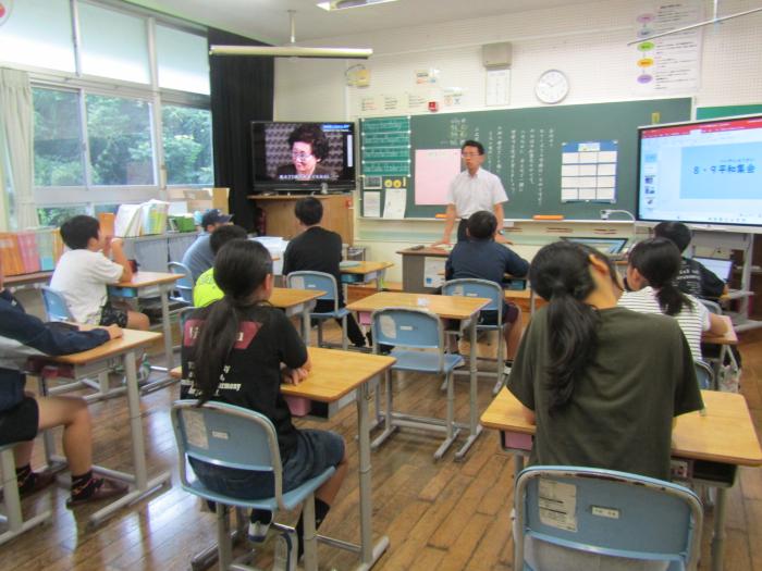 8.9 平和集会   今日は、「県民祈りの日」です。原爆で犠牲者のご冥福をお祈りするとともに、子どもたちと平和について考えました。