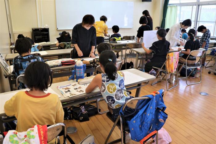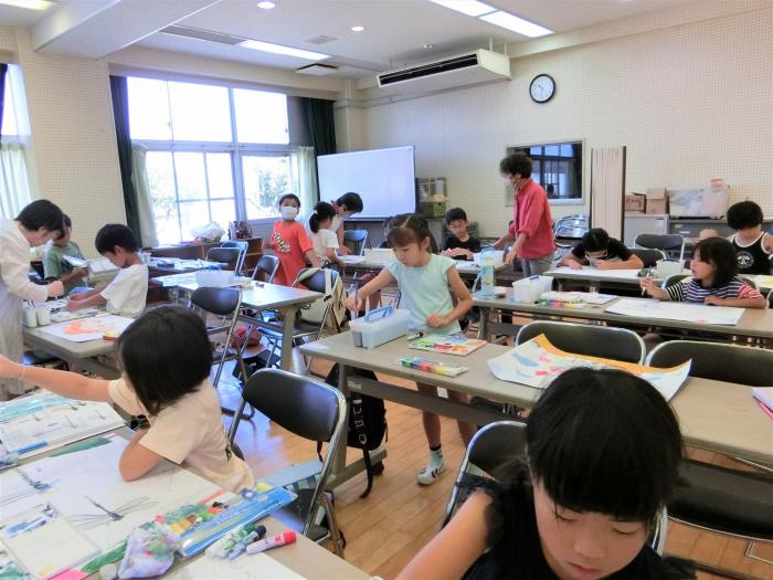絵画教室(高学年) 昨日26日に引き続いて、絵画教室・高学年の部が開催されました。今日も地域で活動されている水彩画サークル・彩(いろどり)の方々をお招きし、高…