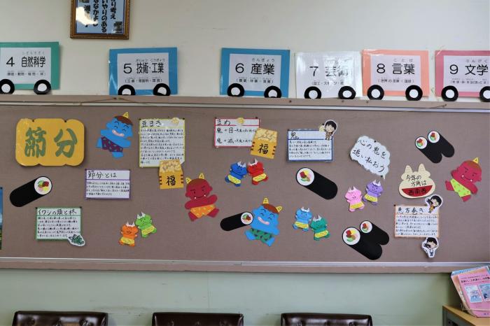 図書室飾り(節分) 子供たちに季節を感じてもらおうと、学校のあちらこちらの掲示板が工夫されています。今日から図書室も「節分」にちなんだ飾りつけにリニューアルさ…