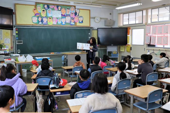 今年度最後の読み聞かせ 今年度最後の読み聞かせが、2年生・4年生の教室でありました。どちらも英語の絵本であったり、「せかいでいちばんさいしょに ズボンをはいた女の…