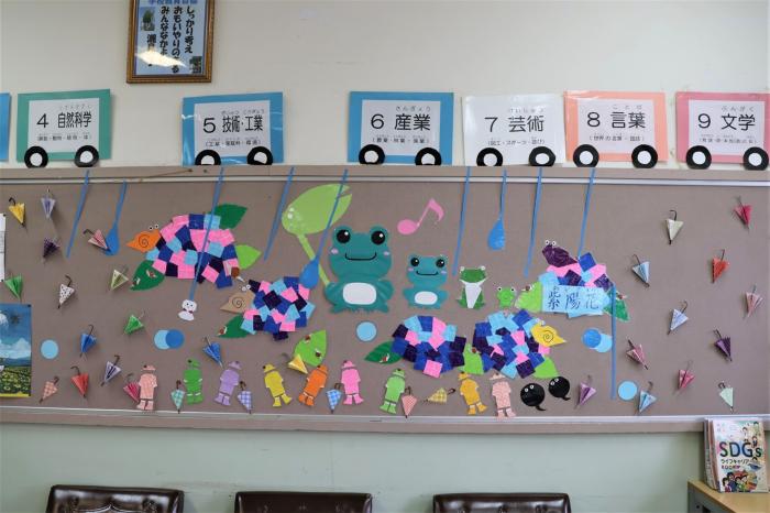 梅雨時の図書室飾り 気がつけば暦は5月下旬、図書室は6月「梅雨」時の飾りに変わっていました。定番のかえるや紫陽花の他に、合羽を着た人が折り紙で作ってありました…