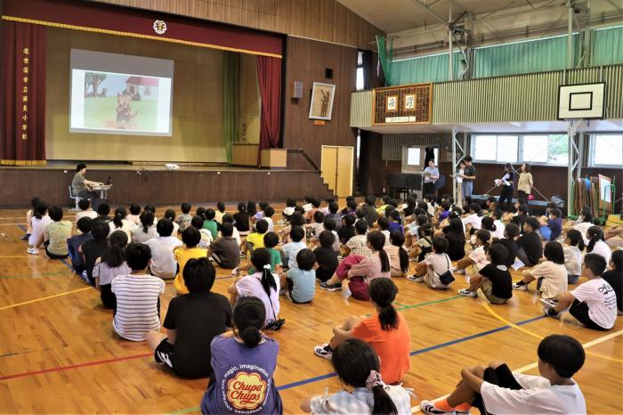 全校読み聞かせ 今日朝から、「For kid's さん」による全校読み聞かせがありました。選定された絵本は「すいかのたね」。今年亡くなられた絵本作家さとう…