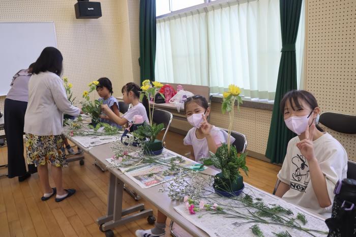 フラワーアレンジメント教室 8月になりました。朝から暑い日でしたが、放課後子ども教室で「フラワーアレンジメント教室」があるということで、10名を超える子供たちが集まり…