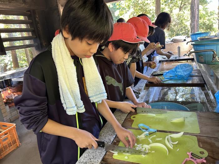 二日目、メインの活動は、何といっても昼ごはんの「カレー作り」です。材料を調理するのはもちろんですが、枝を集め火起こし、薪で火を大きくし具材を煮込みます。また、飯盒でお米も炊きます。上手にできたのでしょうか。お米が少し芯が残って堅かったそうですが、それでも野外でみんなで作るカレーはおいしかったようです。
