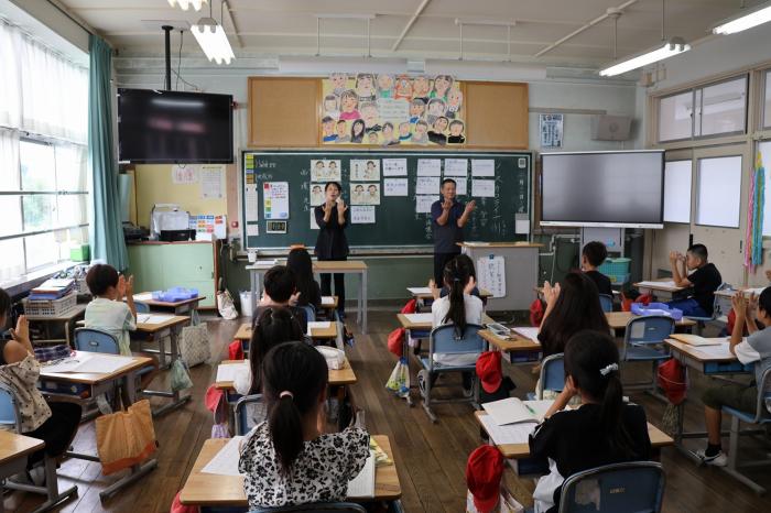 3時間目。様子を見に行ったら、楽しそうに手話を教えてもらっていました。あいさつやありがとう・ごめんなさい、物の形や動きなどを手話で学びました。最後は、自己紹介として「はじめまして。私の名前は○○です。よろしくお願いします。」を手話でできるようになりました。
