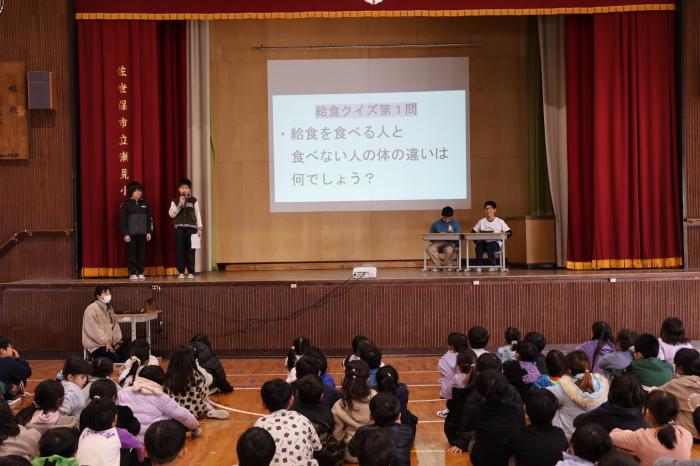 1月24日〜30日を学校給食週間とし、学校給食の意義や役割、給食を作ってくださる調理員さん方に感謝の気持ちを表すことをねらいとして取組を行っています。その中の一つが給食集会です。集会では、給食委員会の司会進行で、委員会の発表やクイズ、表彰、えいようの歌をみんなで歌いました。