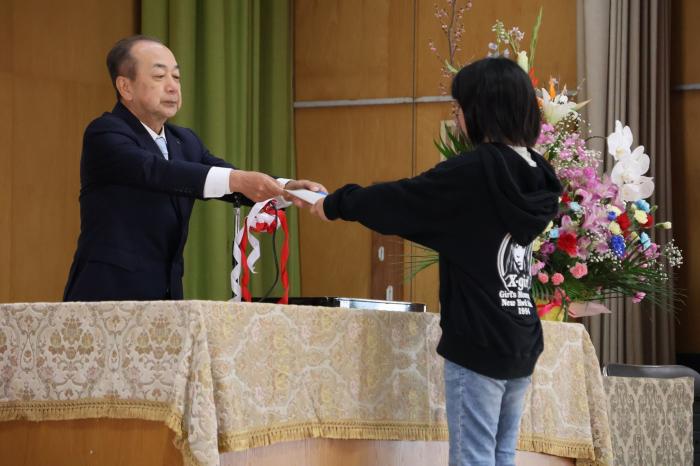 令和7年度の修了式を行いました。まずは、修了証書授与です。各学年の代表児童に渡しました。次は、校長の話です。手渡した修了証書の意味、あゆみに記されたそれぞれの3学期の頑張り、お家の人としっかり見てほしいことを話しました。また、作文発表(3・4年代表)を聞いて、自身の一年間を振り返ってほしいことも話しました。
