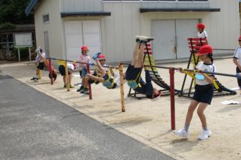 鉄棒 3年生が鉄棒運動に取り組んでいました。挑戦したい技を決めて、自分で練習の仕方を選びます。友達と見合ったり、教え合ったりして練習することが学…