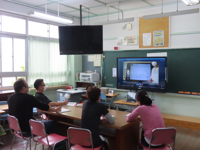 |  | 校内研修 相浦小で開かれた校内研修。高島分校職員も「スカイプ」(テレビ会議システム)にて研修を参観しました。