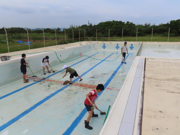 |  | プール清掃 全員でプール掃除を行いました。前日に小学校・中学校の保護者に手伝っていただき、本日はその仕上げです。なにせ6名だけなので、1年生は更衣室の…