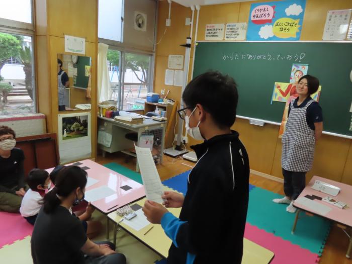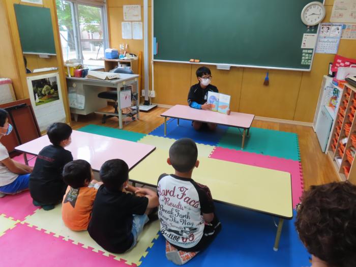 |  | 読み語り 今年2回目の読み聞かせ。1回目は職員が行いましたが、今回は5年生が選書し、「ぞうくんのあめふり」を読み語ってくれました。