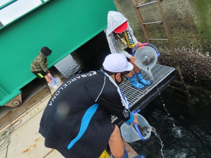 |  | 稚魚の放流と牡蠣の観察 水産課の職員を迎え、東桟橋にて、カサゴの稚魚放流を行いました。元気に育って!という願いを込めて放流しました。 その後、牡蠣の養殖を営まれてい…