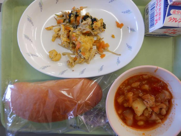卵入り野菜のソテー、ポークビーンズ、コッペパン、牛乳