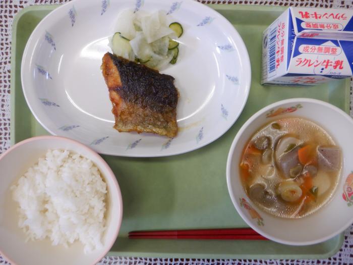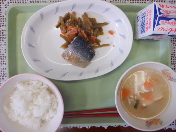 茎わかめの炒め煮、サバの塩焼き、里芋の味噌汁、ごはん、牛乳