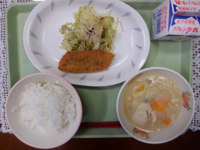 長崎県産しいらのカレー揚げ、レモン和え、けんちん汁、ごはん、牛乳