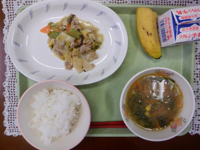 八宝菜、チンゲン菜のスープ、ごはん、牛乳、バナナ