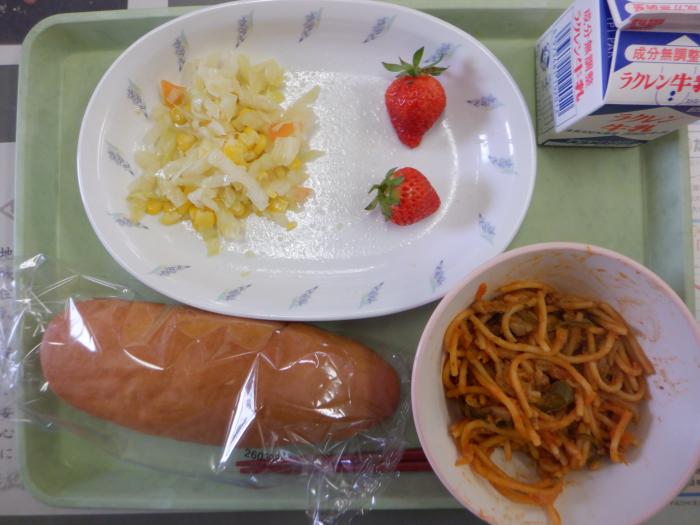 いちご、コールスローサラダ、スパゲティナポリタン、コッペパン、牛乳