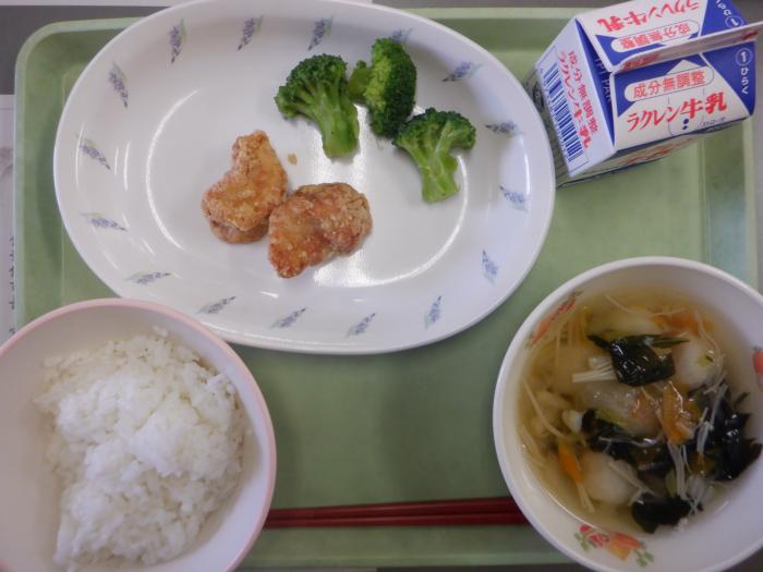 鶏の竜田揚げ、ブロッコリーのおひたし、ごはん、つみれ汁、牛乳