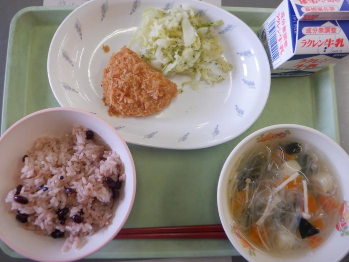 赤飯、ロースとんかつ、かおり和え、春雨汁、牛乳