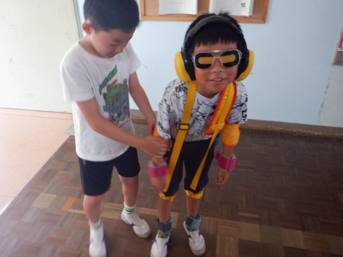 まずはお年寄り体験です。体に装具をつけると、あっ…