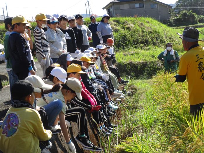5年生 稲刈り 今日は三農会の皆様のお世話により、5年生が稲刈りの体験をさせていただきました。6月に田植えをしてから4ヶ月。黄金に輝く田んぼで上手に鎌を使い…