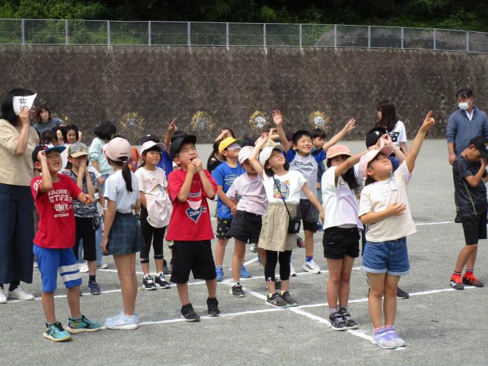 航空写真撮影 今日は午後から全校児童で航空写真撮影を行いました。