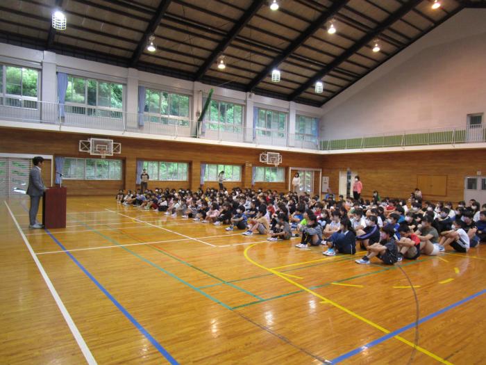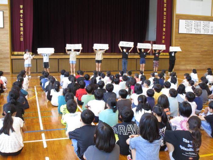 全校朝会 今朝は全校児童が体育館に集まり、全校朝会を行いました。