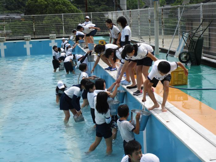 プールそうじ 今日は午後から5年生と6年生がプールそうじに取り組みました。1年間でたまったプールの汚れを一生懸命落としてくれました。みんなのためです。