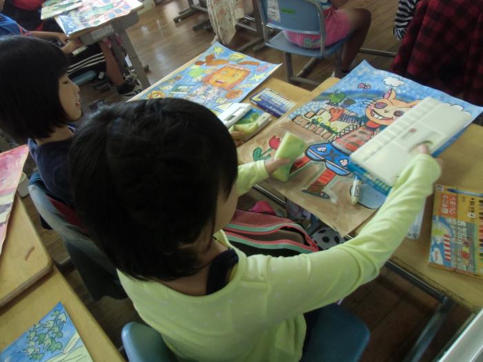 読書感想画(3年生) 心に残った物語を絵に表しています。大胆な構図と丁寧な彩色に心がけています。
