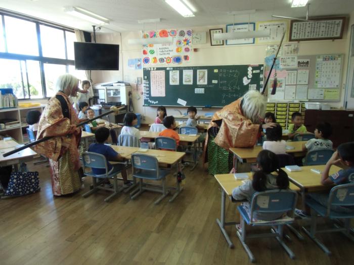 カラス天狗来校 10月6日と7日は、吉井町の春日神社のくんちです。7日朝には、ご神体のおのぼりとともに、カラス天狗が来校してくれました。持っている槍で頭をな…