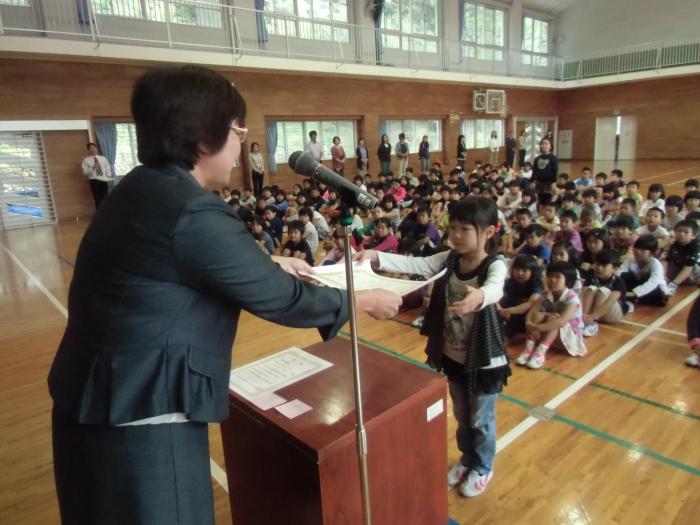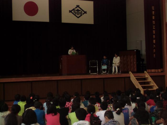前期終業式 今日は前期終業式です。終業式に先駆けて「お魚の絵コンクール」で市長賞を受けた児童の表彰をしました。その後の校長先生のお話の中で、各学年に宿題…