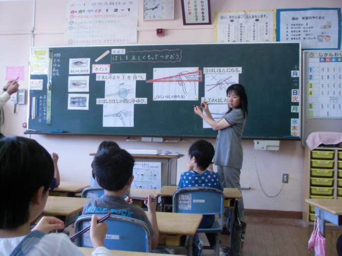 授業参観 今日は授業参観と懇談会を行いました。2年生は、栄養教諭の先生と一緒に「はしの使い方」の勉強をしました。