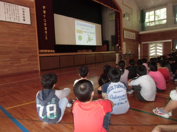 親子健康学習会 県の臨床心理士の先生をお招きして、親子健康学習会を開催しました。保護者の皆様や地域の方々、総勢100名と子どもたち全員で、「ストレスに強い子…