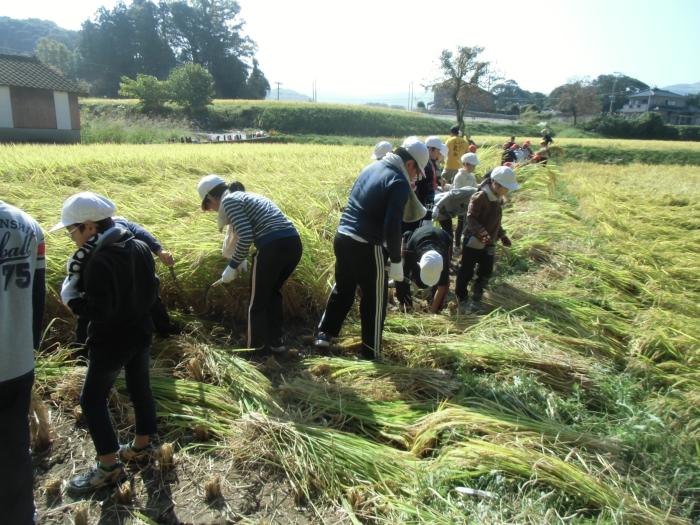 稲刈り(5年生) 大切に育てていた稲をとうとう刈り取るときがきました。自分の名札の付いた苗を手刈りしました。機械で刈り取る方法も教えていただきました。
