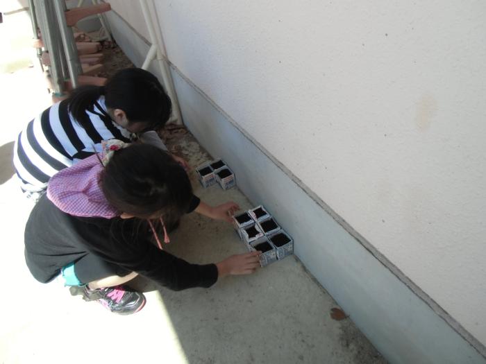 種まき(3年生の理科)   ひまわりとホウセンカの種をまきました。種の形や色について調べた後に、牛乳パックにまきました。早く大きくなるように、水やりをがんばります。