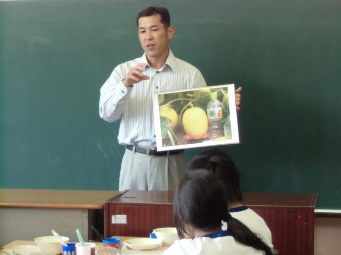 生産者出前講座(吉井リゾートメロン)   今日の給食の献立に、吉井のリゾートメロンが出ました。その生産者でいらっしゃる、井手さんが子どもたちにメロンについてお話をしてくださいました。